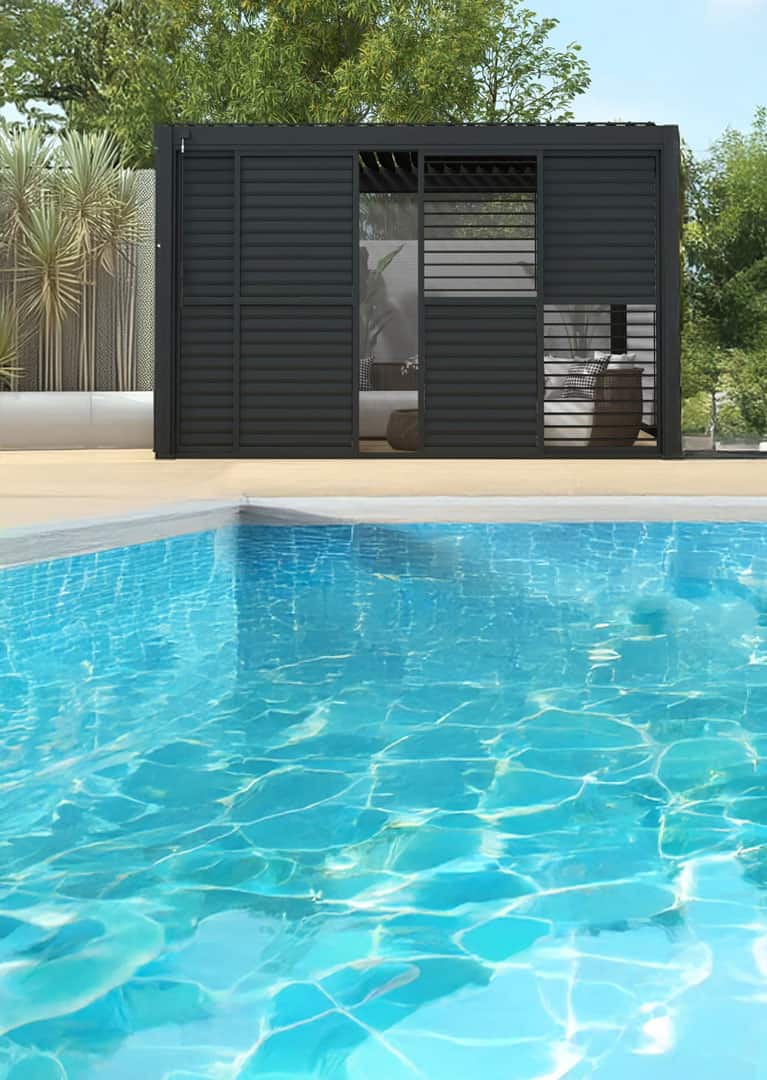 Regulowane żaluzje pozwalają precyzyjnie kontrolować ilość światła wpadającego do wnętrza pergoli oraz poziom prywatności, bez całkowitego zamykania przestrzeni. Dzięki niezależnym segmentom na górze i na dole każdych z drzwi, możliwe jest elastyczne kształtowanie otwarcia, co sprzyja naturalnej wentylacji i zachowaniu komfortowego mikroklimatu pod zadaszeniem.
