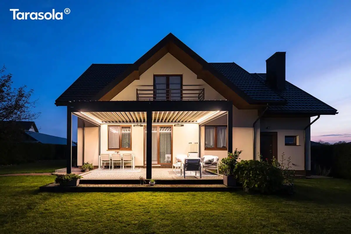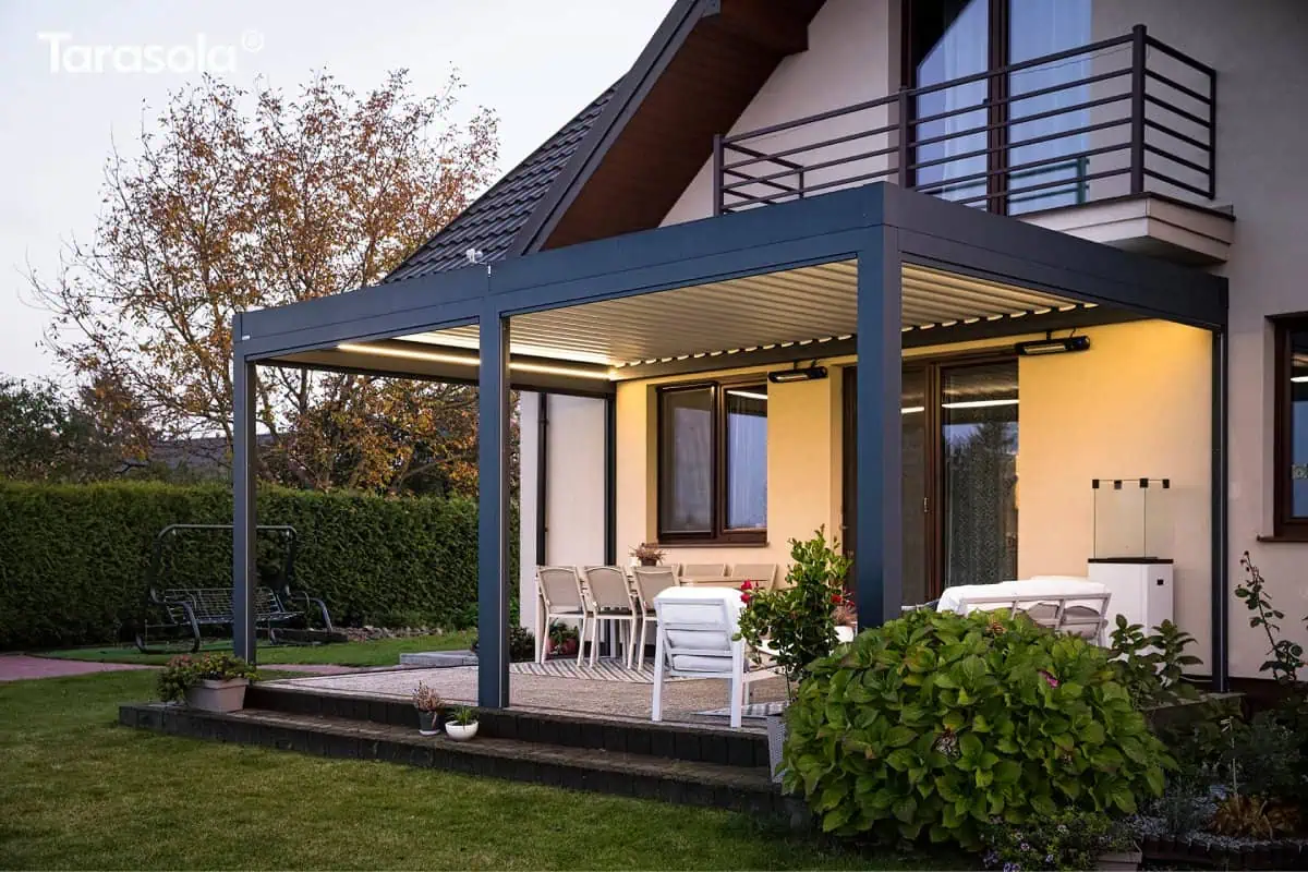 Pergola lamelowa Essential to lekka, nowoczesna pergola z dachem wykonanym z lameli aluminiowych. Pergola wzdłużna posiada panele lamelowe ułożone równolegle do ściany, do której zamontowana jest pergola. Obracane lamele w pozycji zamkniętej chronią taras przed słońcem i deszczem, a w pozycji uchylonej wpuszczają promienie słoneczne oraz umożliwiają cyrkulację powietrza. Konstrukcja pergoli wykonana jest z ekstrudowanego aluminium i posiada system odprowadzania wody w standardzie. Dla komfortu użytkowania zadaszonej przestrzeni, pergolę można doposażyć w zintegrowane taśmowe oświetlenie LED.