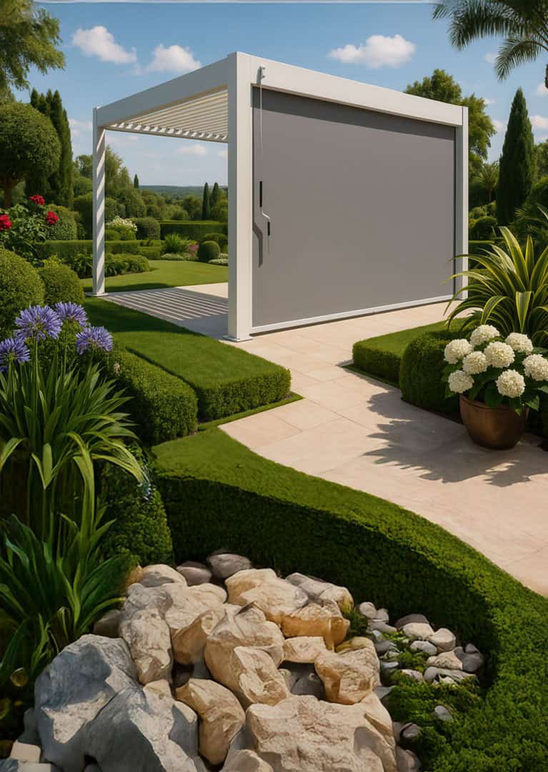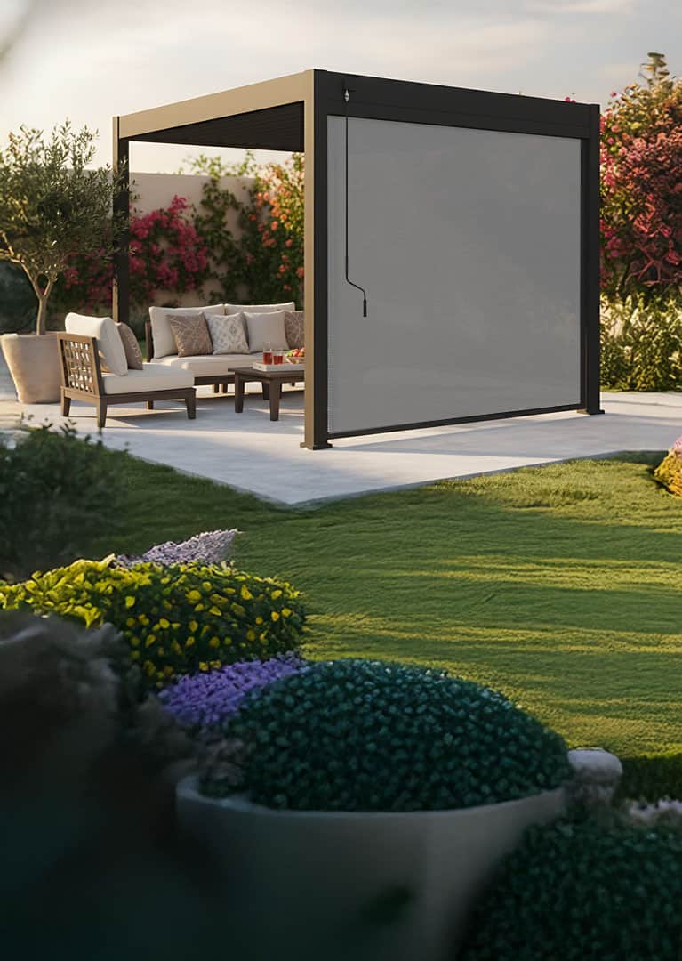 Zastosowana wytrzymała tkanina winylowa ogranicza przenikanie promieni UV, redukuje nagrzewanie i jednocześnie zachowuje lekki, półprzezroczysty charakter, dzięki czemu przestrzeń pod pergolą pozostaje jasna i przyjemna. Rolety mogą być montowane na jednej, kilku lub wszystkich ścianach pergoli, umożliwiając stworzenie w pełni osłoniętej i prywatnej strefy wypoczynku – zarówno w ogrodzie prywatnym, jak i w przestrzeniach komercyjnych.
