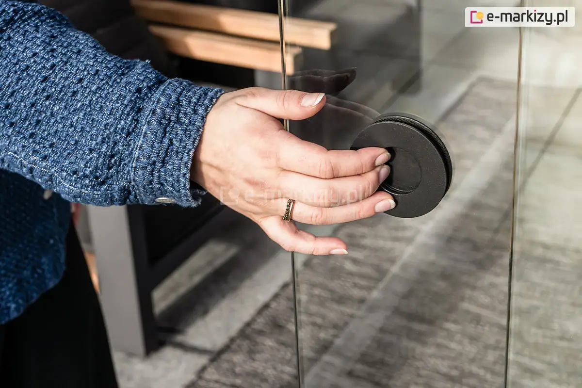 Otwieranie i zamykanie drzwi przesuwnych odbywa się za pomocą uchwytów, których rozmieszczenie zależy od wybranego sposobu otwierania. Do wyboru są uchwyty przykręcane, wymagające otworu o średnicy 50 mm nawierconego w szkle lub różne wersje uchwytów samoprzylepnych.