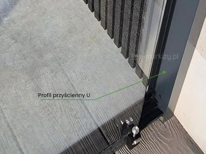 Profile przyścienne „U” są w standardzie każdego systemu, niezależnie od szerokości i ilości paneli. Profil przykręcamy do ściany lub np. słupów pergoli, co skutecznie doszczelnia konstrukcję.